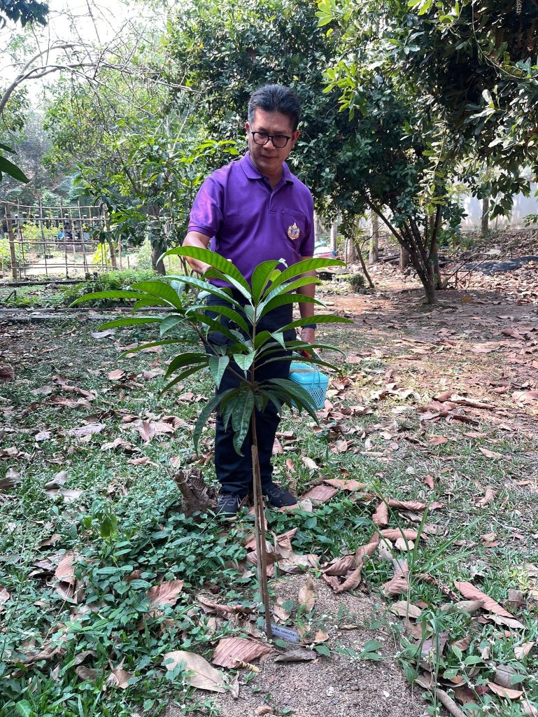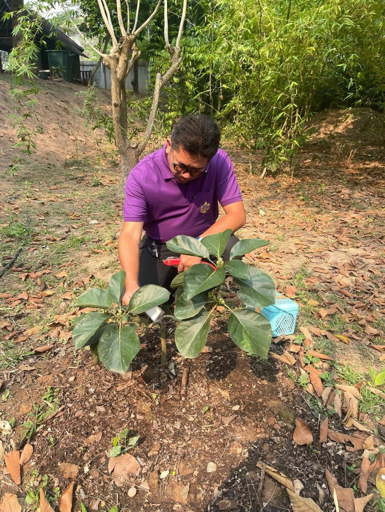 จากนั้น ได้มอบต้นเซียนท้อ สายพันธุ์รักบี้ จำนวน 2 ต้น สายพันธุ์จัมโบ้ จำนวน 3 ต้น ให้แก่เจ้าหน้าที่ผู้ดูแลแปลง เพื่อนำไปปลูกในพื้นที่พระตำหนักธงน้อย พร้อมให้คำแนะนำกับเจ้าหน้าที่เกี่ยวกับการปลูก การดูแลรักษาไม้ผลภายในแปลงต่อไป